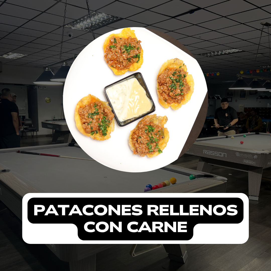 Crocantes patacones rellenos con nuestra combinación especial de carne molida rebozada en la salsa roja del Chef Nelson. Porción de 4 unidades.