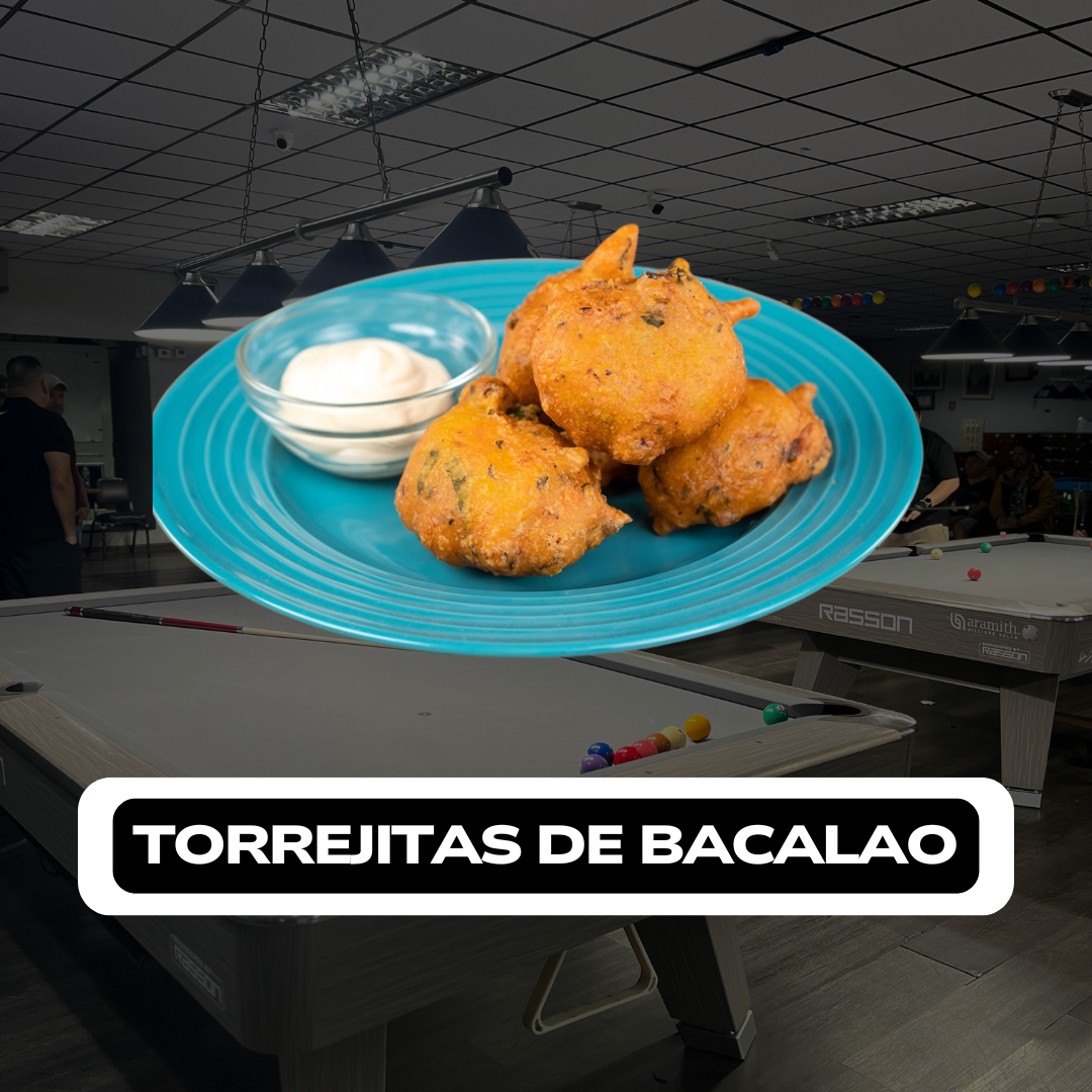 Ricas torrejitas de harina con el mas fresco bacalao, el cual esta condimentado con los secretos de nuestro chef, las cuales te haran agua la boca.